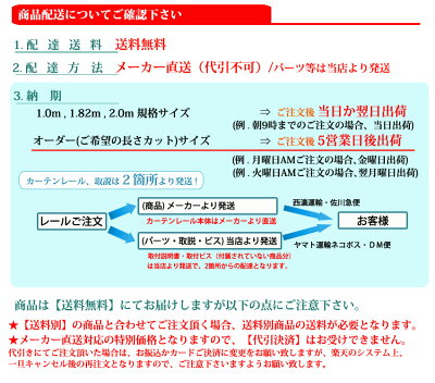 ■カーテンレールご販売価格(税込・送料無料)■ 1.00m 1.82m 2.00m シングル 各色・各タイプ ¥2,180 ¥2,880 ¥3,180 ダブル 各色・各タイプ ¥3,780 ¥4,880 ¥5,280 ■商品バリエーション■ ご注文の際にカラー、サイドキャップ仕様をお選び下さい ファンティアトップカバー仕様はこちら TOSO製リネアはこちら ベーシック伸縮タイプはこちら 3,980円 4,480円 5,480円 1,280円 1,980円 カーテンも販売中です。