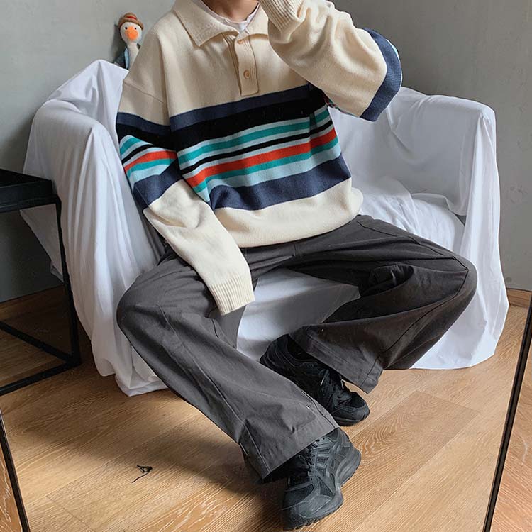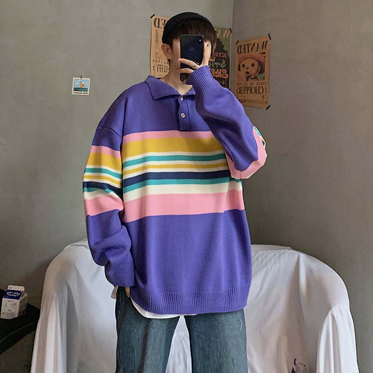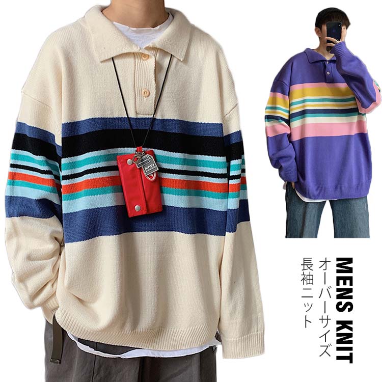 オーバーサイズ 長袖 ニット ボーダー柄 ニット セーター メンズ ポロシャツ風 ニットセーター 襟付き ニット 防寒 ニットセーター 秋冬 厚手